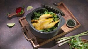 Gà Hấp Lá É Trắng Và Sả Chấm Muối Lá É Trắng